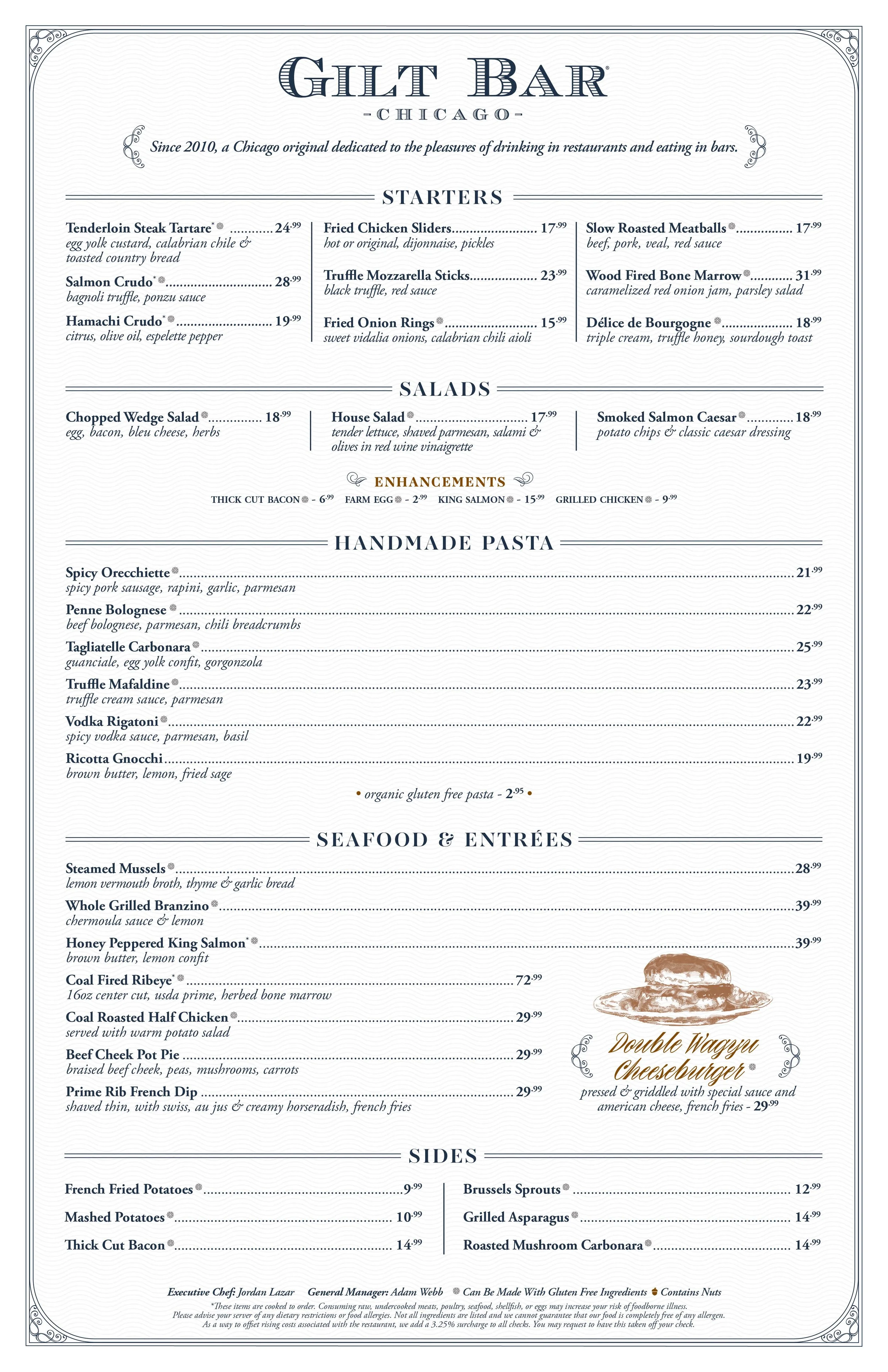 Please advise your server of any dietary restrictions or food allergies. Not all ingredients are listed and we cannot guarantee that our food is completely free of any allergen. As a way to offset rising costs associated with the restaurant, we add a 3.25% surcharge to all checks. You may request to have this taken off your check.